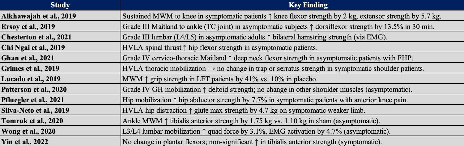 What the Research Shows:Our research capstone project found 13 high-quality studies that fit our inclusion criteria: studies from 2019 onward, with symptomatic and asymptomatic patients, using objective strength measurements (handheld dynamometry, EMG, isokinetic dynamometers), with a comparison or control group, and changes in strength of local muscles measured within 24 hours of the intervention.See the table for the KEY findings for each study